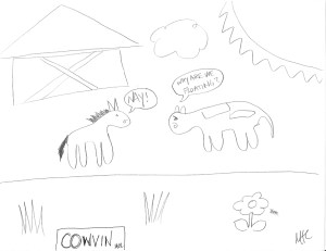 Meet Cowvin (Cowvin #1) Posted byMark T. CollinsAugust 30, 2008February 9, 2016Posted inCowvin, Cowvin Original This is Cowvin. He is getting used to life on the farm. More importantly, he is getting used to life inside a child’s drawing. (click picture for bigger view) Share: Click to share on X (Opens in new window) X Click to share on Facebook (Opens in new window) Facebook Click to share on Pinterest (Opens in new window) Pinterest Like Loading... Related